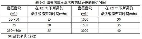 使用高壓蒸汽滅菌器滅菌時,將分裝好的培養液放入底部有一定量(淹沒加熱管)涼水的高壓蒸汽滅菌器內,增壓**0.35~0.4 kg/cm2時排凈滅菌器內冷空氣,以便使蒸汽能到達各個消毒部位,保證消毒滅菌徹底。然后繼續加壓加熱,當壓力表讀數達到1.0~1.1 kg/cm2為121 ºC,保持15~20 min即可。由于消毒滅菌效果取決于溫度而不是壓力,所以在一定壓力下保持較長的消毒滅菌時間是必須的。在121 ºC的蒸汽溫度下可以很快殺死各種細菌及高度耐熱的芽孢桿菌,因此許多培養液的消毒滅菌壓力、溫度一般保持在1.0~1.1 kg/cm2、121 ºC。消毒滅菌時間與需要消毒滅菌的培養液量密切相關(表2-3),時間不足達不到滅菌效果,時間過長培養液內的一些化學物質遭到破壞,影響培養液成分。消毒滅菌結束后,關閉熱源,只有當滅菌器內壓力降為零時才能打開放氣閥,排除剩余蒸汽,取出培養液。不可在壓力較高時打開放氣閥,引起減壓沸騰,使容器中液體溢出。培養液組成中如含有遇熱易分解的物質,則需用過濾方法消毒滅菌。shou先對培養液中耐熱組分進行高壓蒸汽滅菌后放置在無菌場所,固體培養液在40 ºC左右瓊脂即將凝結前,加入經過過濾除菌的不耐熱溶液,混勻后冷卻備用。液體培養液在冷卻到室溫后再加入過濾除菌溶液。過濾除菌時,使用孔徑為0.22~0.45 μm或更小的細菌濾膜。過濾除菌可利用抽濾裝置或注射過濾器進行,所用器皿均應進行高壓消毒滅菌,溫度不應超過121 ºC。
