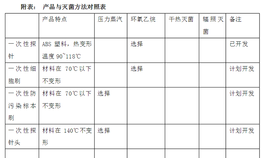 綜上所述,依據商品熱變形溫度和滅菌條件,一次性探針和一次性細胞刷選用環氧乙烷滅菌;防污染標本刷選用壓力蒸汽滅菌和無菌加工。